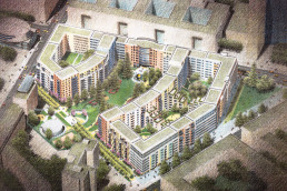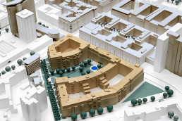 Gesamtkoordination für die Planung von Büro- und Wohngebäuden, als Blockrandbebauung, bestehend aus insgesamt 17 eigenständigen Hochhäusern mit teilweise gemeinsamen Tiefgaragen, eines öffentlichen Parks im Blockinnenbereich, eines Stadtplatzes und einer KITA. Außerdem Ausführung der Leistungsphasen 2 bis 5 für einzelne Gebäude in mehreren Bauabschnitten.