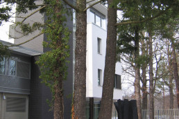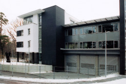 Im Erweiterungsbau befinden sich Büros für rd. 100 Mitarbeiter des Verwaltungsdienstes und zusätzlich öffentlich zugängliche Räume für den Prüfungs- und Schulungsbereich. Die drei U-förmig angeordneten Baukörper des Erweiterungsbaus umschließen in ihrem Zentralbereich die neue Garage für 14 Messfahrzeuge und bilden über der Garage einen von Alt- und Neubau umschlossenen Innenhof aus, der als Pausenbereich für die Mitarbeiter dient.