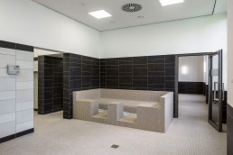 Ausnahmen stellten das großflächige Wandmosaik in der Halle und die Natursteinverkleidungen in den Eingangsvorräumen dar. Anhand historischer Aufnahmen konnten Rückschlüsse auf die ursprüngliche Oberflächengestaltung gezogen werden. Aus dem historischen Hallenbad ist ein modernes Sauna- und Schwimmbad geworden, das in Bezug auf die Ausstattung und Anlagentechnik sowie gemäß den Energieeinsparvorgaben auf dem neuesten Stand ist und gleichzeitig seiner Funktion als Denkmal gerecht wird.