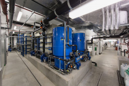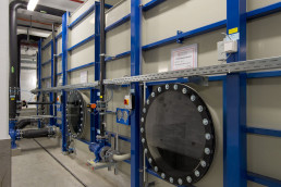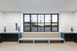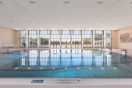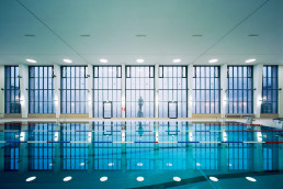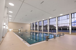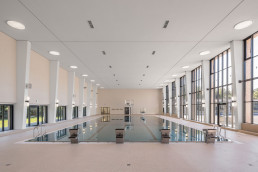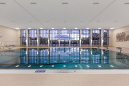 Das in den 1930er Jahren erbaute Hallenschwimmbad befindet sich auf dem Gelände der Julius-Leber-Kaserne in Berlin. Als Teil des denkmalgeschützten Ensembles, erfolgte die Energetische Sanierung in enger Abstimmung mit dem Landesdenkmalamt in drei Bauabschnitten. Die Schwerpunkte der Modernisierungen lagen auf dem dringenden konstruktiven und energetischen Sanierungsbedarf, sowie auf dem Austausch der veralteten Anlagentechnik. Die Sanierung des Innenbereichs erfolgte weitgehend freigestellt von denkmalrechtlichen Auflagen, da der Bestand in der Vergangenheit stark verändert worden und schützenswerte originale Bausubstanz nicht mehr vorzufinden war.